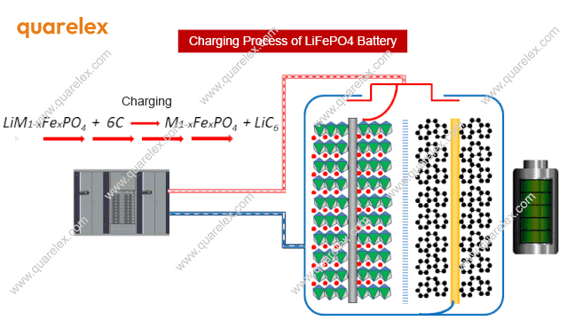 When charging, under the action of the electric field force, lithium ions enter the electrolyte from the surface of the lithium iron phosphate crystal, pass through the diaphragm, migrate to the surface of the graphite crystal, and then embed in the graphite lattice.