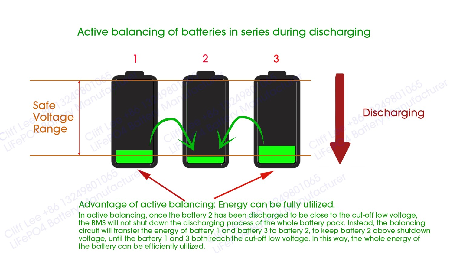 In active balancing, battery cells are balanced by means of power transfer, with high efficiency and low loss. Different manufacturers have different methods, and the equalizing current also ranges from 1 to 10A. Compared with passive balancing, which is suitable for small-capacity, low-series lithium battery pack applications, active balancing is suitable for high-series, large-capacity power lithium battery pack applications.